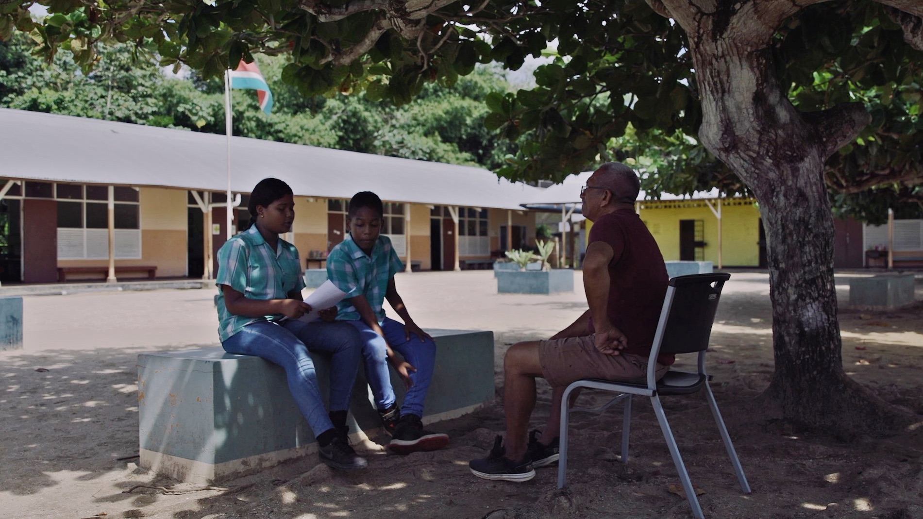 Edgar Comvalius (1960) ontmoet Xavi, Renaja, Drishti, Ghivar en Alicia onder de grote manjaboom op het schoolplein van de Ritfeldschool in Paramaribo. Hij laat de leerlingen een groene gulden zien, een briefje geld dat nu niet meer bestaat. Het was vroeger meer waard dan een Nederlandse gulden. De leerlingen mogen het niet vasthouden want het valt al bijna uitelkaar. Als iedereen zit, stellen de leerlingen de eerste vraag.