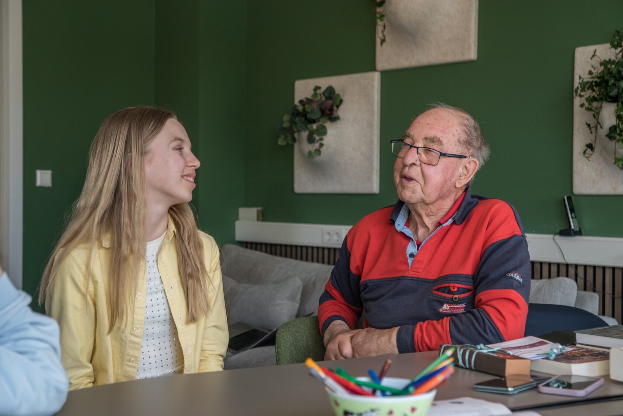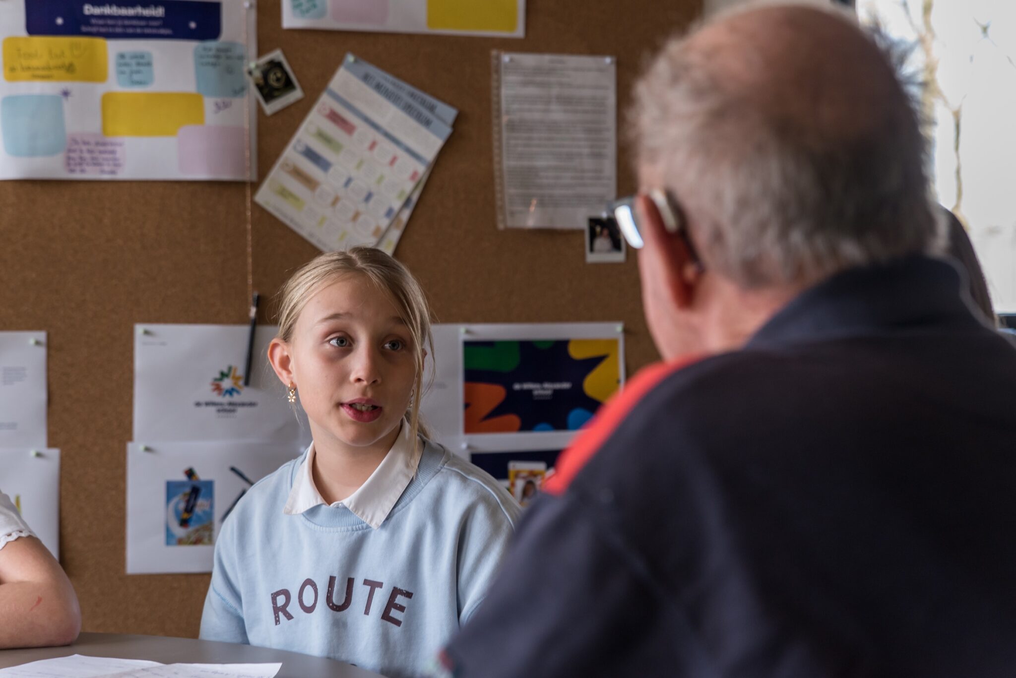 Als de leerlingen van de Willem-Alexanderschool in Bergen de lerarenkamer binnenlopen, zit Gerrit Sijpheer (84) er al. Het is een sfeervolle kamer met uitzicht op het schoolplein en op veel groen. Otis, Serhii, Leah en Cato zijn een beetje laat en hebben daarom nog even geen tijd voor een kopje thee. Ze installeren zich aan de grote tafel en stellen de eerste vraag.