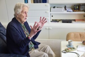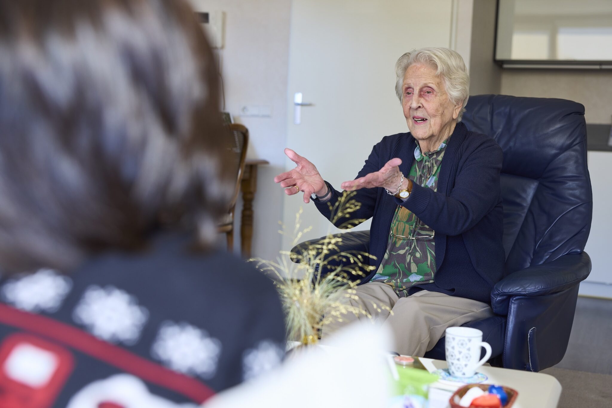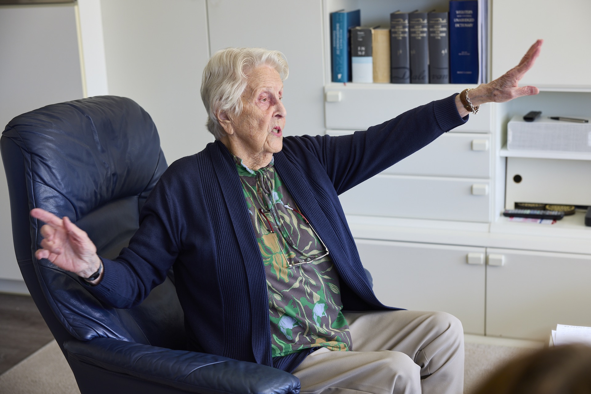 Mevrouw Van der Woude-Zulver (1926) is geboren in Indonesië. Op haar twaalfde kwam ze terecht in een Japans interneringskamp. En toen ze 20 jaar oud was kwam ze naar Nederland. Nu nog als ze beelden op televisie ziet van oorlogen, dan heeft ze daar heel veel moeite mee.