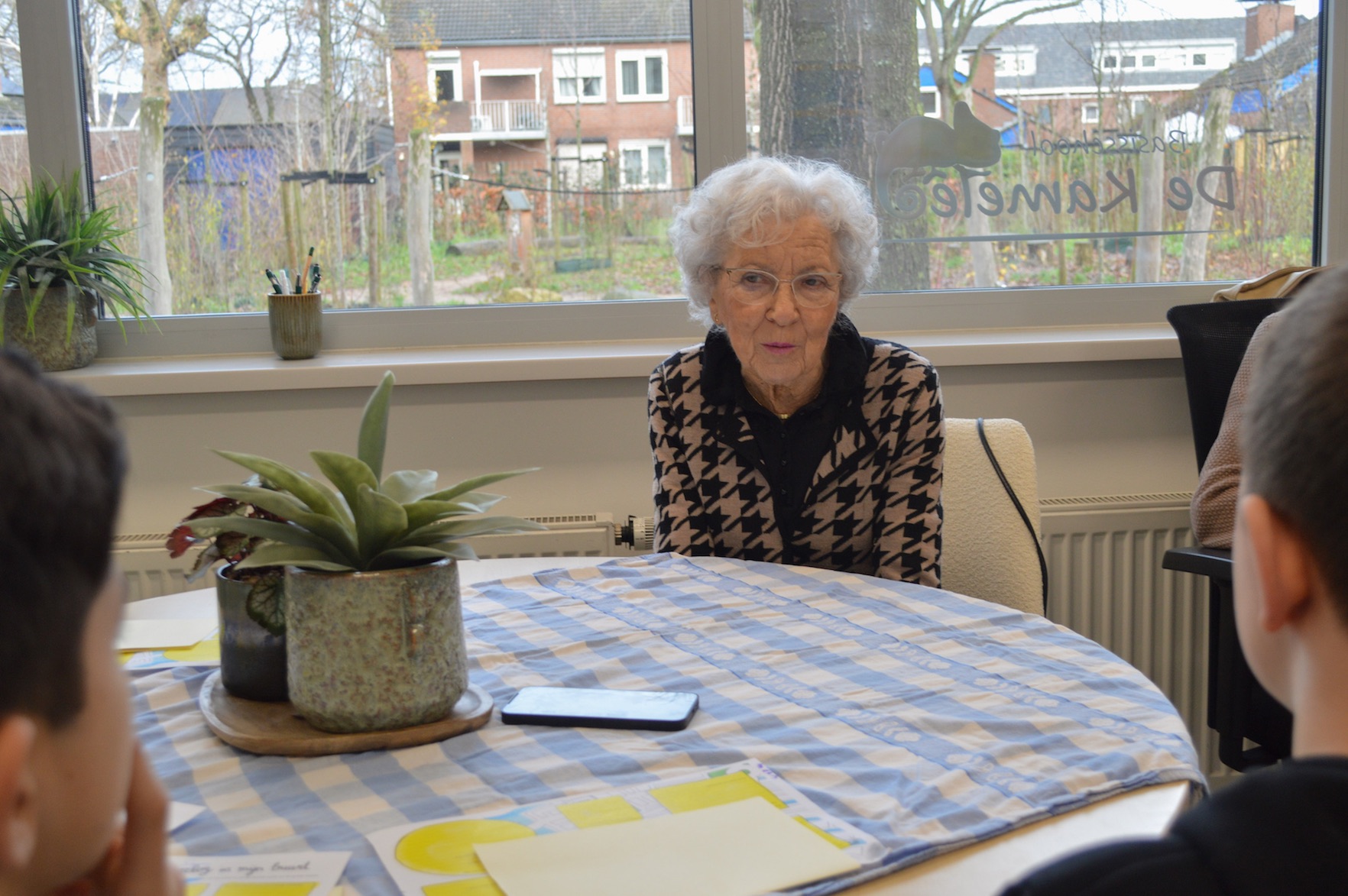 Truus Tullemans bezoekt basisschool De Kameleon in Weert waar ze door leerlingen Jenny, Rayaan, Maks, en Sami wordt ontvangen. Samen nemen ze plaats in een lokaaltje dat de leerlingen gezellig hebben ingericht, speciaal voor haar. Jenny maakt intussen foto’s van de ontmoeting. Mevrouw Tullemans komt uit een gezin van zeven broers en zussen. Ze woonden op een boerderij in Nederweert-Eind. Ze was 2 jaar oud toen de oorlog begon.