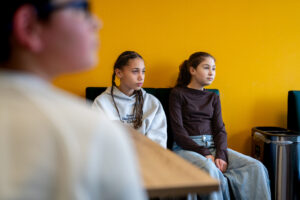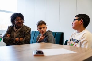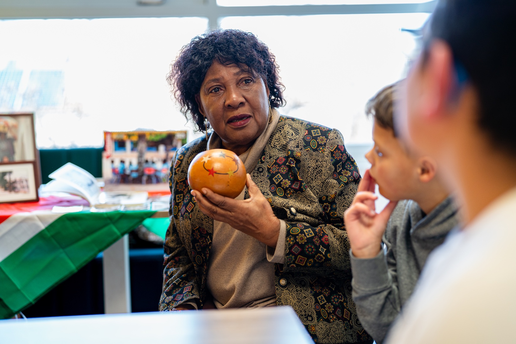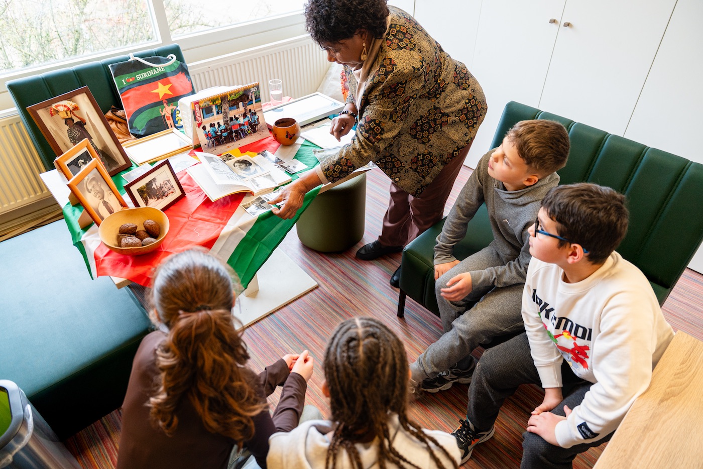 Wat gespannen maar vrolijk zit Carmen Schaken al te wachten op haar interviewers Raf, Adam, Abi en Nina van basisschool Philipsdorp in Eindhoven. Ze stelt voor om er ‘een gezellig gesprek’ van te maken. Mevrouw Schaken is geboren in 1950 in Paramaribo en kwam in 1968, toen ze 18 was, naar Nederland. Ze heeft foto’s en spullen meegenomen om haar verhaal tastbaar te maken en ze trakteert de kinderen op zelfgebakken Surinaamse koekjes.