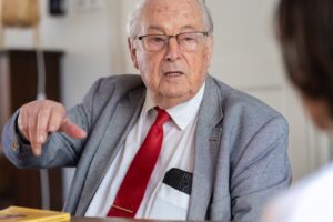 Tibeau, Doortje en Polina zijn heel benieuwd naar het verhaal van Dre Rennenberg (1936). Hij was 4 jaar toen de oorlog begon en woonde aan de Leostraat in Eindhoven. Meneer Rennenberg (later ambtenaar in Eindhoven) schreef een boek over zijn herinneringen aan deze tijd. De drie leerlingen van basisschool de Hasselbraam willen weten hoe hij zich voelde. Toen de oorlog begon was hij nog erg jong, zegt hij, een gevoel is dan ook niet goed te omschrijven. Maar gedurende de oorlog voelde hij meer en meer angst.