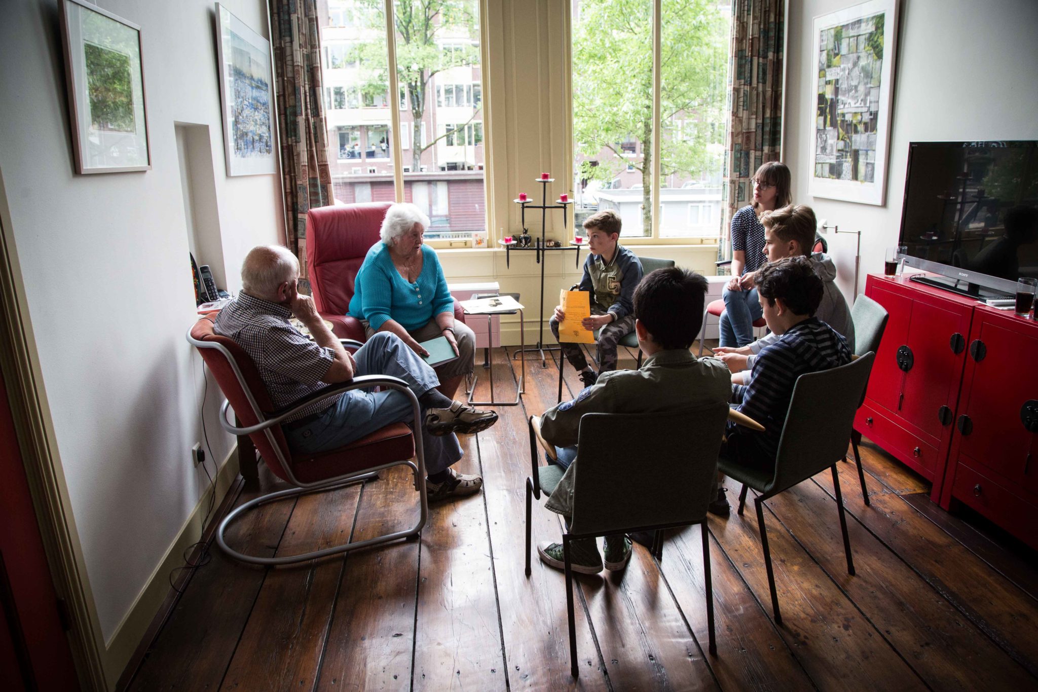 Yuna, Danthe, Wessel en Josephine van de Bos en Vaartschool praten met Anneke Francissen over haar herinneringen van de oorlog. Mevrouw Francissen is de oudste dochter in een gezin van elf kinderen. Ze woonde met haar vader en moeder en twee broertjes in de Duvenvoordestraat. In de oorlog werden nog drie broertjes en zusjes geboren. Ze was zeven toen de oorlog begon. ‘Ik herinner mij de oorlog als een periode die wel heel ‘anders’ was, maar ik was nooit echt angstig. Eigenlijk ging voor ons het leven ‘gewoon’ door.’