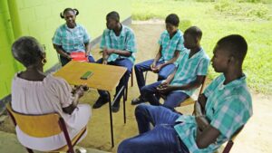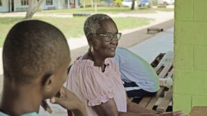 Supiyan, Clifiensa, Davinio, Sylvion en Jozua van de openbare school Wonoredjo in het noordoosten van Suriname interviewen Florence Hupsel (1945). Mevrouw Hupsel is in Paramaribo geboren, ze kwam naar Moengo toen ze 15 jaar oud was. De leerlingen hebben veel vragen gesteld over wat ze allemaal in Moengo heeft meegemaakt.