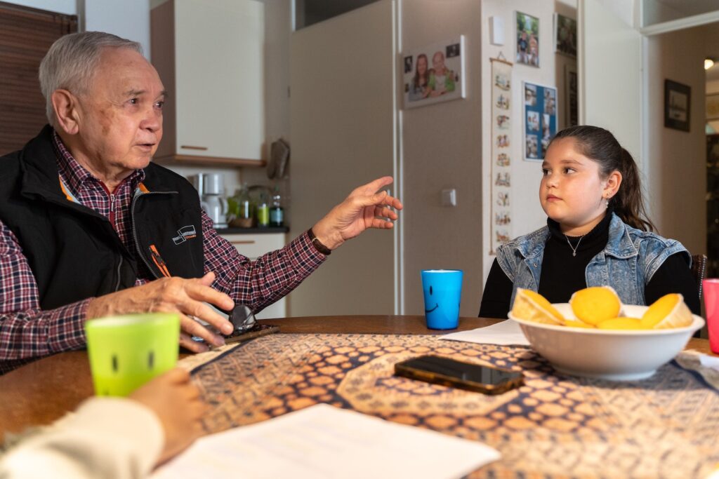 Ans van de Heuvel ontmoet Shelina, Amal, Tyler en Dawid van basisschool ’t Karregat in Eindhoven bij ’t Oude Raadhuis. Ze was drie jaar toen de oorlog begon en woonde toen met haar ouders en twee zussen en broer in de Bosboomstraat. Haar vader, die bij de politie werkte, waarschuwde Joode mensen die op een lijst stonden om opgepakt te worden. Ook de opa van Dawid, die uit Polen komt, zat in het verzet; hij moest dat met de dood bekopen. Na de oorlog heeft Ans haar hele leven bij stichting ’40-’45 nabestaanden van verzetsmensen geholpen. ‘Lieve kinderen, jullie hebben de toekomst en ik heb het verleden,’ zegt ze als de kinderen beginnen met het interview.