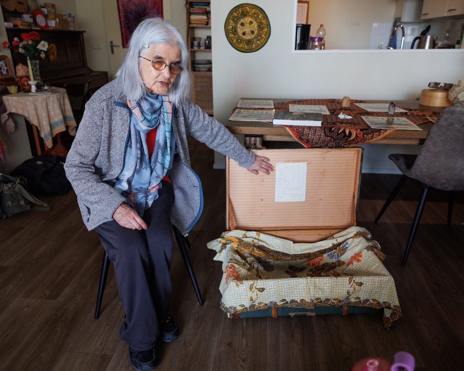 Bij aankomst worden de kinderen warm ontvangen. In de kamer valt meteen een speciaal voorwerp op: de koffer die ze als kind meenam op de bootreis naar Nederland. Aan de muur van haar gezellige appartement hangen veel foto’s van familie.