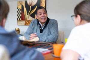 Lien, Max, Lani en Tian van basisschool De Talisman in Eindhoven worden warm ontvangen door Winston Gibbes (74). Levendig vertelt hij over zijn leven, dat begint op Curaçao en zich vanaf 1973 verder afspeelt in Nederland. Zijn verhalen bewegen moeiteloos van jeugdherinneringen naar werk bij Philips en zijn rol als pastoor.